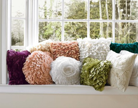 Para añadir un toque de textura en una habitación son perfectos los cojines con volantes, un conjunto de pliegues crea un agradable jardín interior: azul, verde rosa, púrpura, marfil y crema.