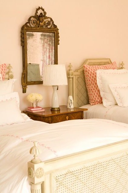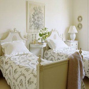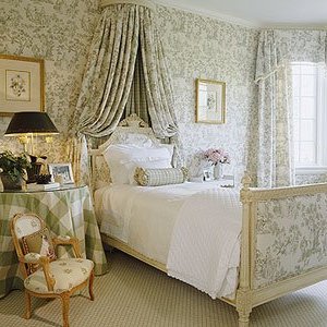 La madera suele ser el mejor material para el suelo, y se puede pintar de un blanco lacado. Los muebles suelen ser hechos del mismo material, y los tapices generalmente son de terciopelo. Los estampados de ropa de cama, manteles, cortinas y cojines, muchas veces, cuentan con motivos florales o de pájaros.